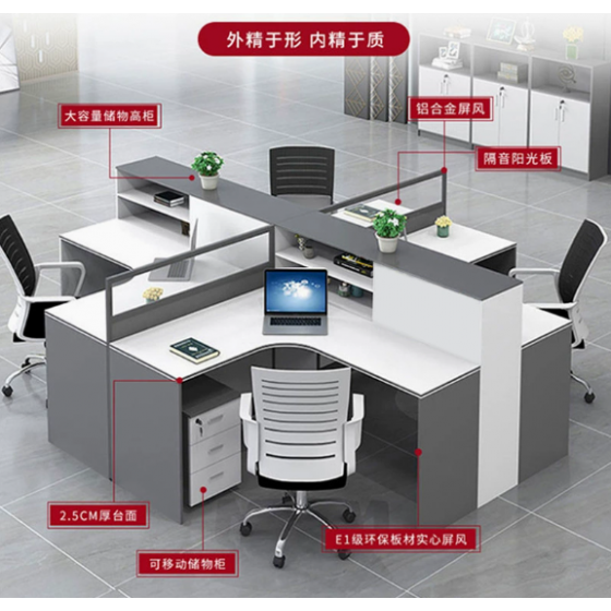 Cross-Shaped 4-Person Office Desk with Cabinet and Chair